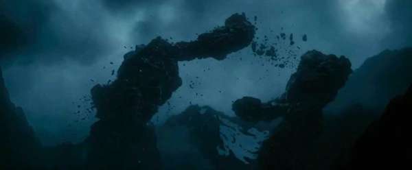 -Minuto 45. Choque de nave élfica en Asgard rompiendo columnas. Brutal.